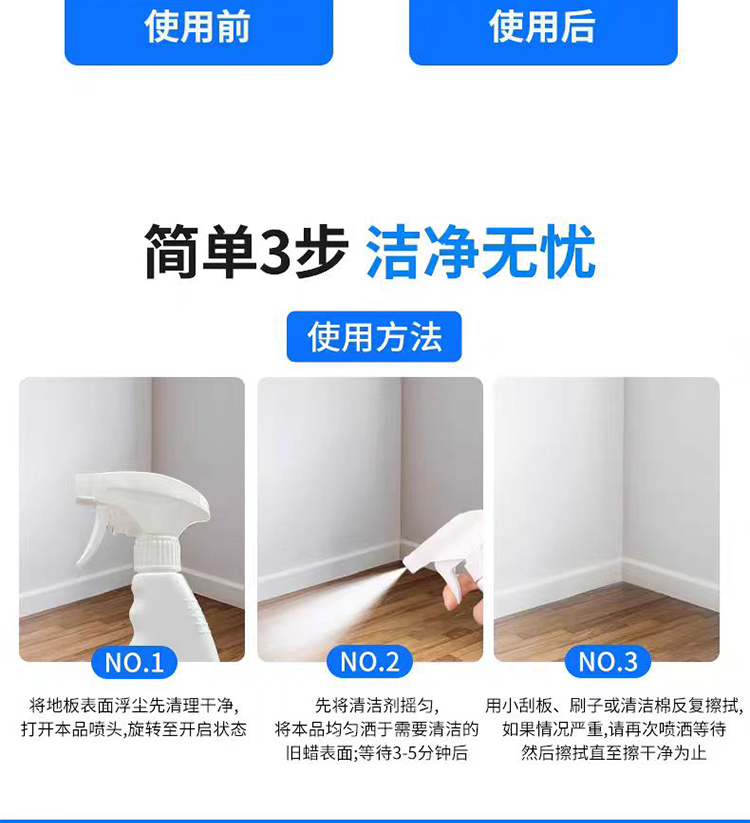 ①将地板表面浮尘先清理干净,打开本品喷头,转至开启状态。先将清洁剂摇匀,将本品均匀喷酒于需要清洁的旧蜡表面;等待3-5分钟后,用小刮板、刷子或清洁棉反复擦拭,如果情况严重,请再次喷洒等待,然后擦拭直至擦干净为止。最后用湿抹布或者清水过滤一遍擦干净。